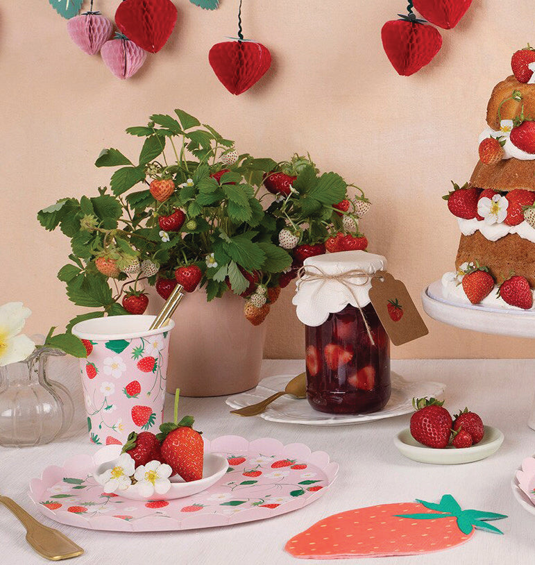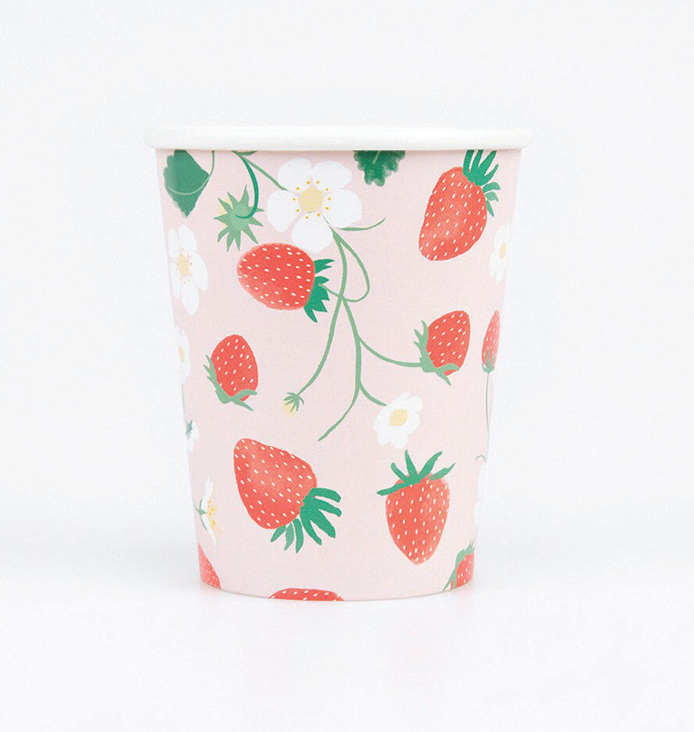 Vasariški, braškėmis iliustruoti popieriniai puodeliai gaiviai gimtadienio šventei.