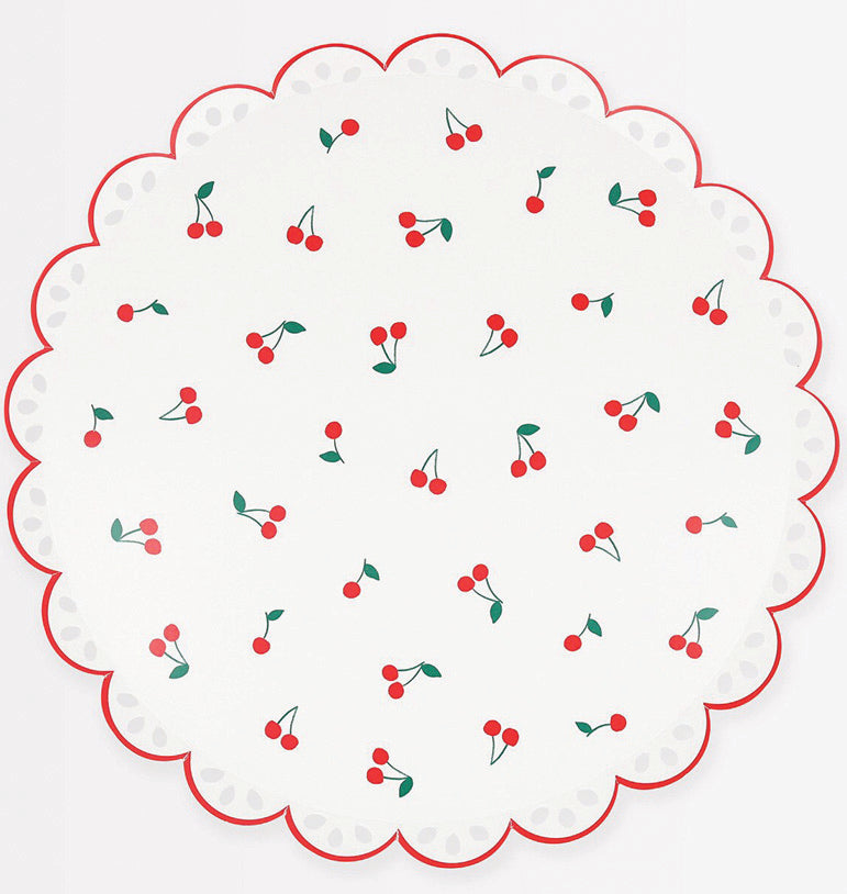 Vasariškos ir dailios popierinės lėkštutės, iliustruotos vyšniomis ir subtiliu banguotu raudonu krašteliu.