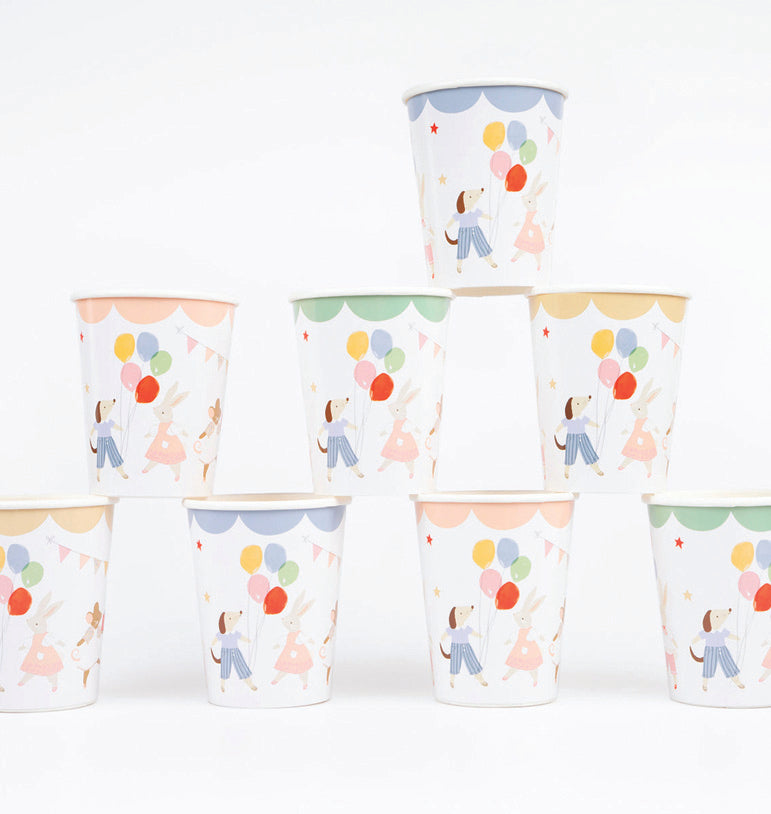 Žaismingi Super Mario tematikos popieriniai puodeliai, iliustruoti Super Mario ir Super Luigi paveikslėliais.